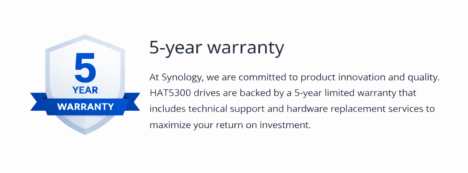Synology HAT5300 HDD offers class-leading performance thanks to tight integration with DSM and Synology hardware. With over 300,000 hours of in-house validation testing and backed by Synology’s 5-year limited warranty.