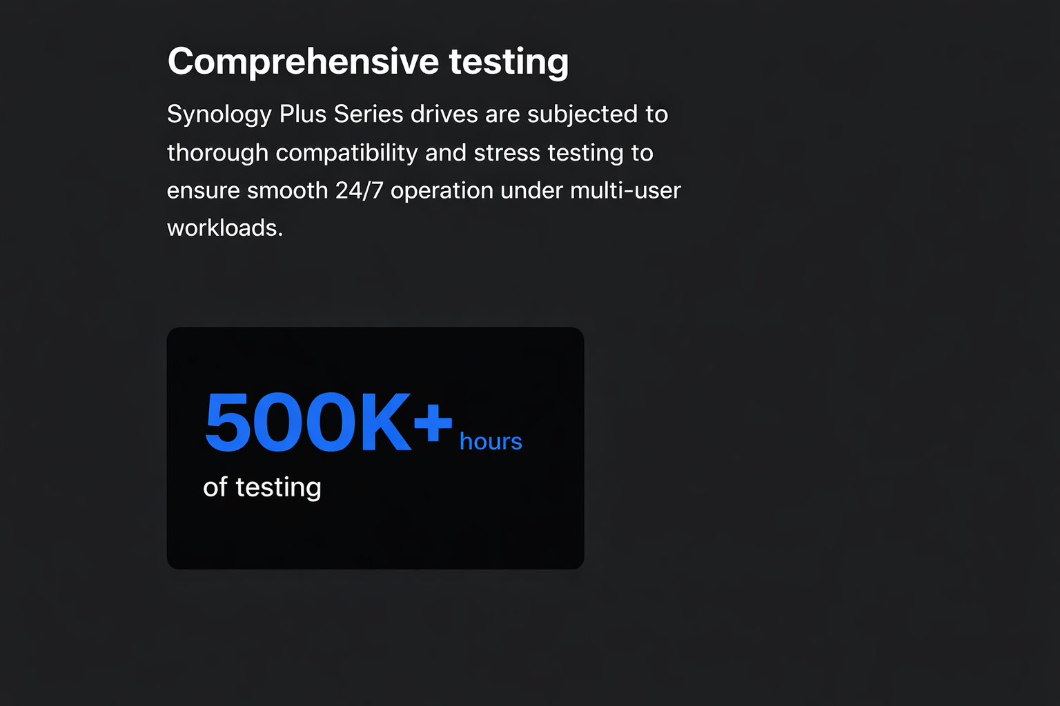 Synology Plus Series HDDs are backed by a 1 million hour mean time between failures (MTBF) rating and 180 TB per year workload rating, up to three times the limit of conventional desktop hard drives. Over 300,000 hours of compatibility and stress testing ensure smooth operation even under multi-user workloads.