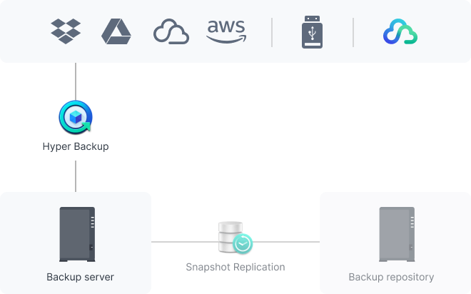 Back up your entire Synology device, including system settings and applications, or select specific folders. Transfer all backup data to multiple destinations using Hyper Backup.