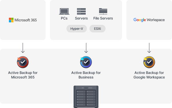 Securely back up Windows clients and servers, Microsoft 365 and Google Workspace accounts, file servers, and VMware® and Hyper-V® virtual machines with the Active Backup Suite. Leverage built-in deduplication technology to reduce backup sizes and multi-versioning to allow flexible restoration.