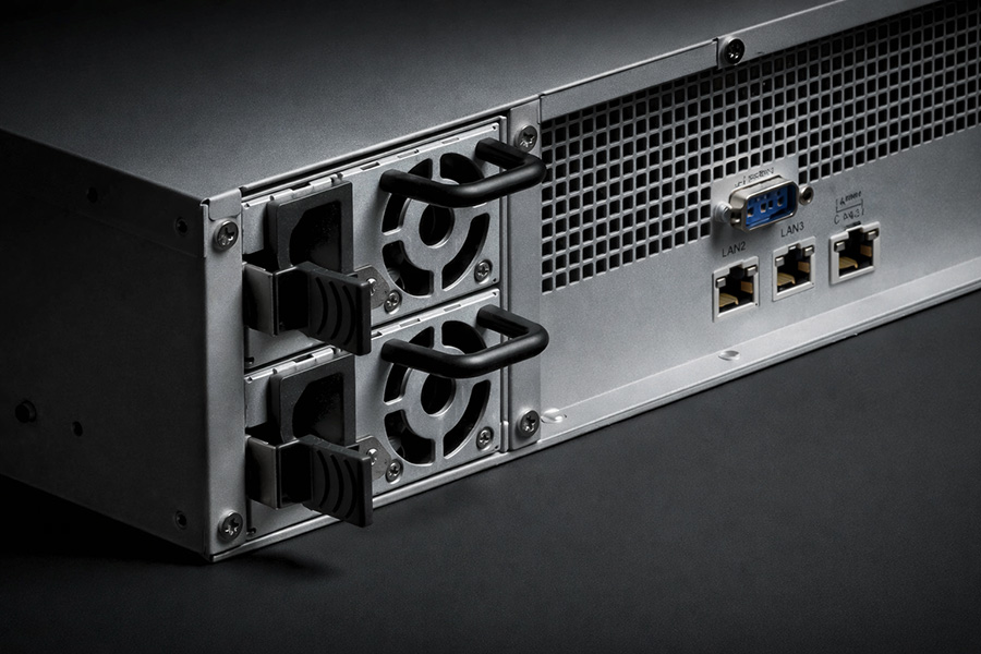 The RS2423RP+ also features redundant and hot-swappable power supply units to protect service continuity in case there are issues with one power source.