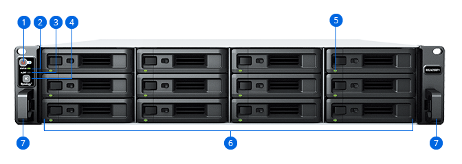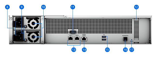 The RS2423RP+ and RS2423+ come with one 10GbE RJ-45 port and two Gigabit RJ-45 ports, which can be bonded with Link Aggregation to enable automatic network failover and load balancing.