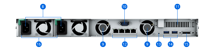 RS822RP+/RS822+ comes with four Gigabit RJ-45 ports which can be bonded with Link Aggregation to enable automatic network failover and load balancing.