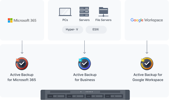 Securely back up Windows and Linux endpoints, Synology servers, and VMware® and Hyper-V® virtual machines with Active Backup for Business.