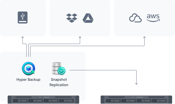 Back up files, LUNs, installed applications, and system configurations to destinations including Synology C2 Storage,6 public cloud platforms, USB devices, file servers, local folders, or other Synology systems.