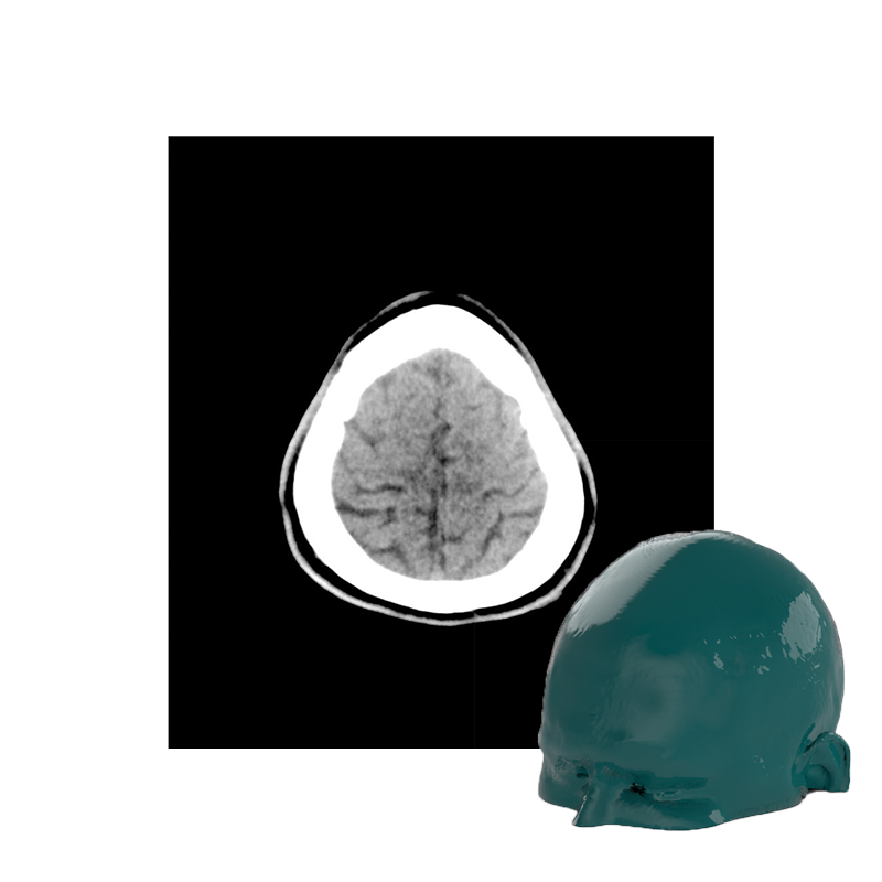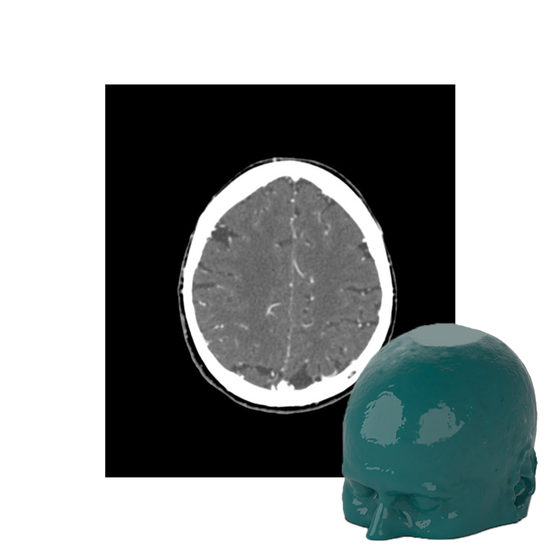This phantom simulates a head with stroke and bleeding patterns. It covers the vertex to the foramen magnum.