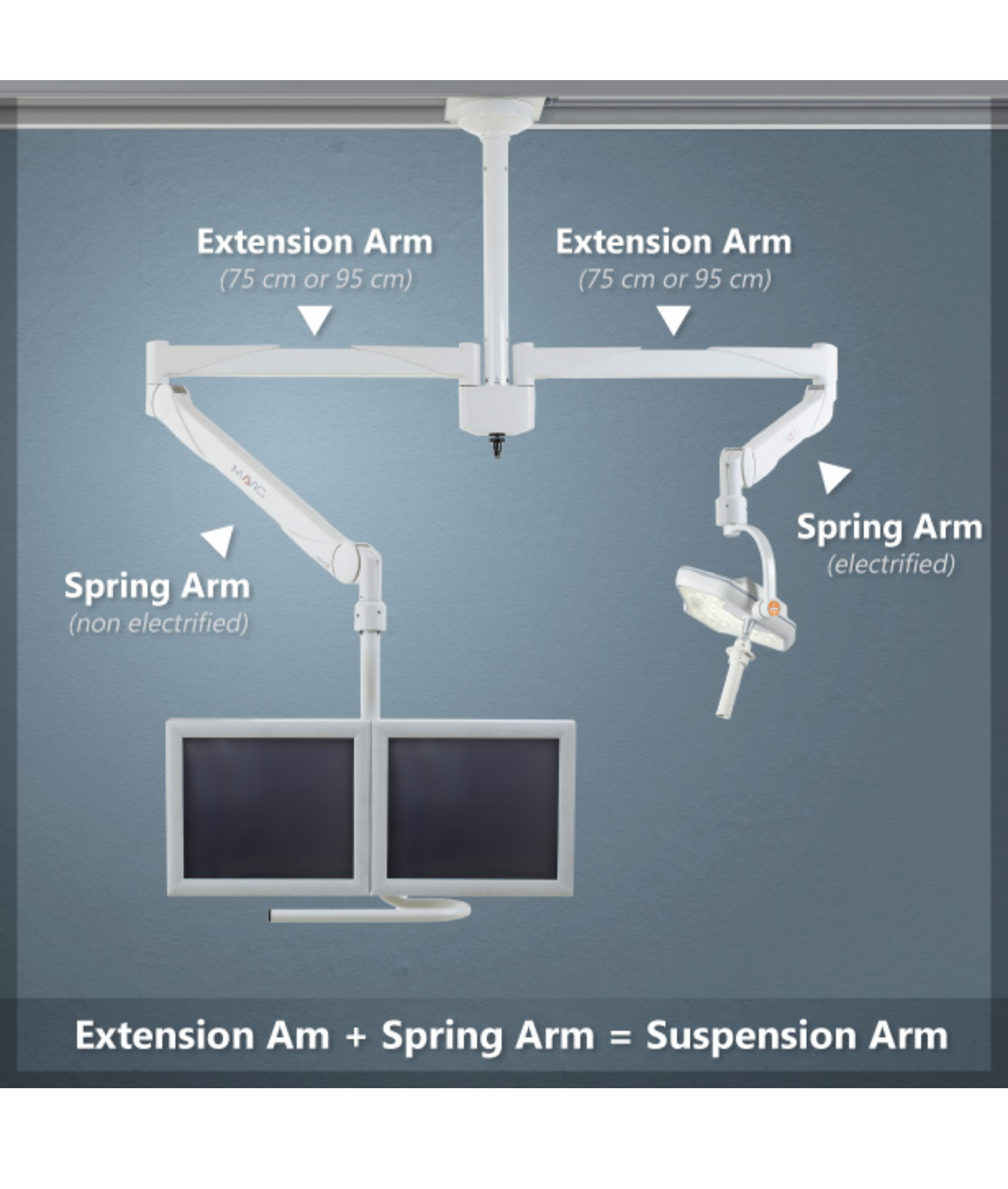 Protective shields, lamps, monitors, injectors and other accessories can be attached and positioned as required. The extension / spring arm combination offers a large range of different load bearing categories: