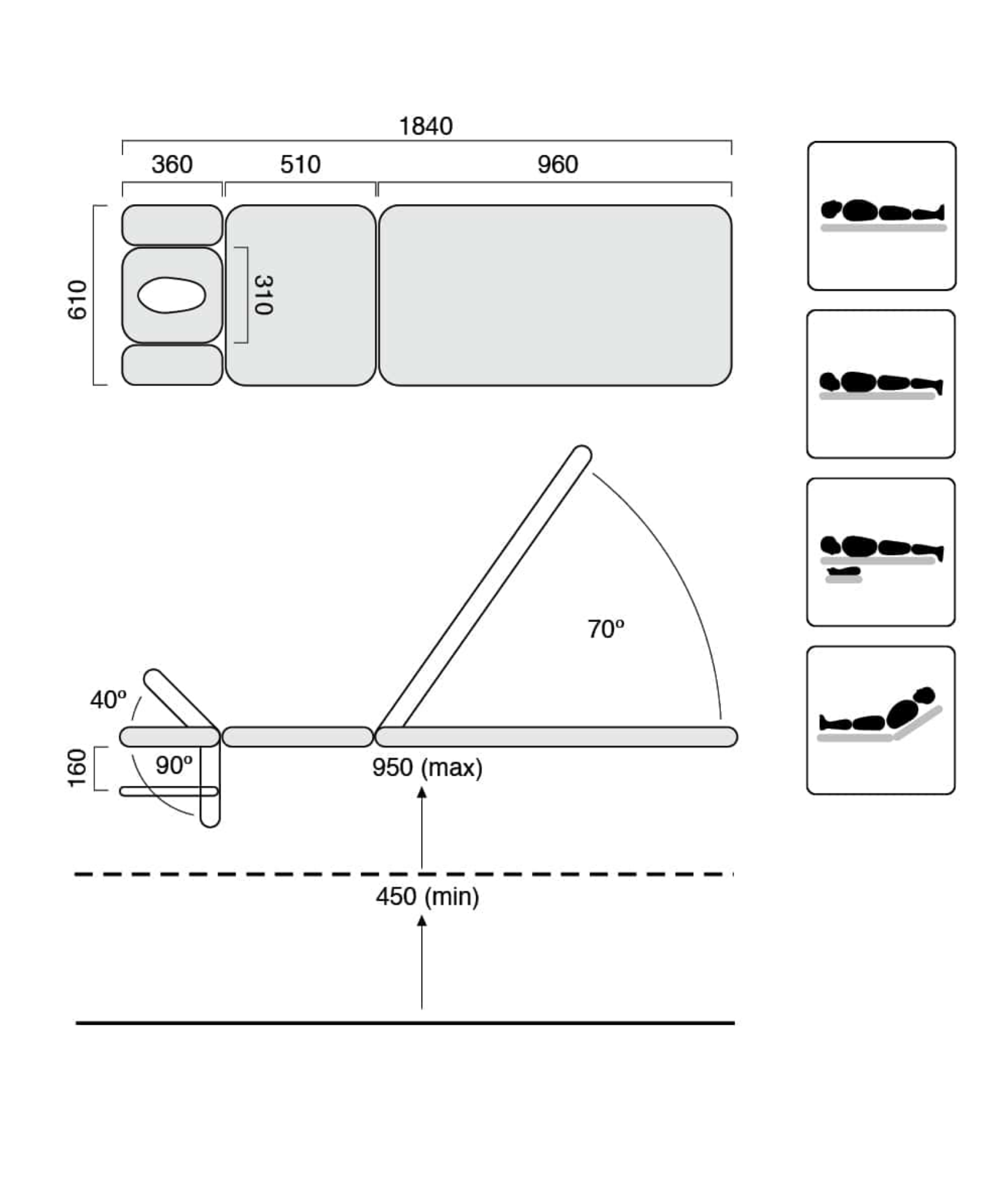 The five section is similar to our three section treatment table but with the addition of forward adjustable arm rests. This table is the ideal option for manipulative therapists also requiring a treatment style table to work on. The head section with face hole can adjust from -90º to +40º with the leg section manually adjusting from flat to +70º.