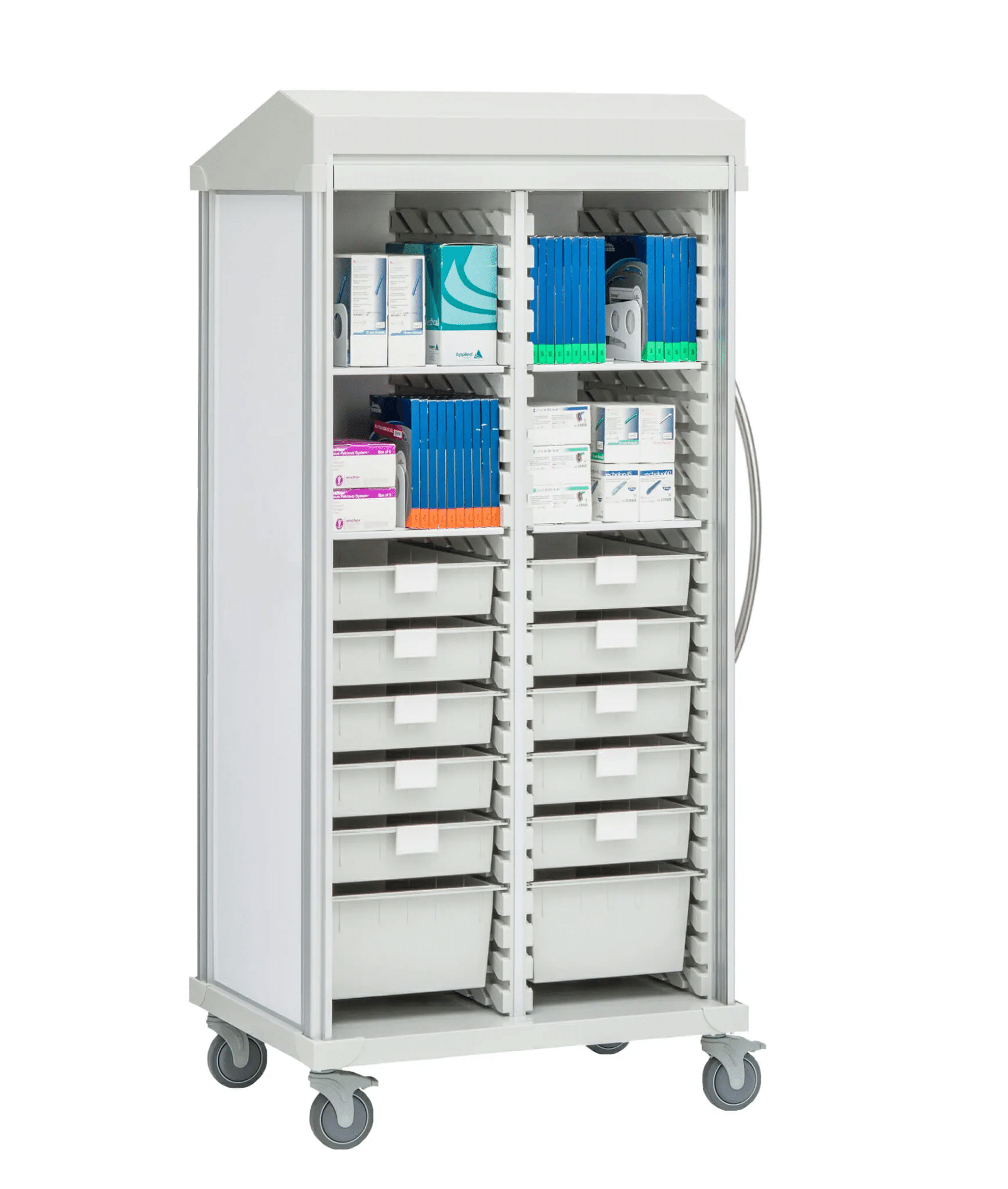 Roam high-density, mobile medical carts maximize space in an efficient footprint. Two heights, four widths, door and lock options, flexible interior and procedure-specific accessories, and a range of preconfigured and specialty carts give Roam medical supply carts broad application throughout a healthcare facility.