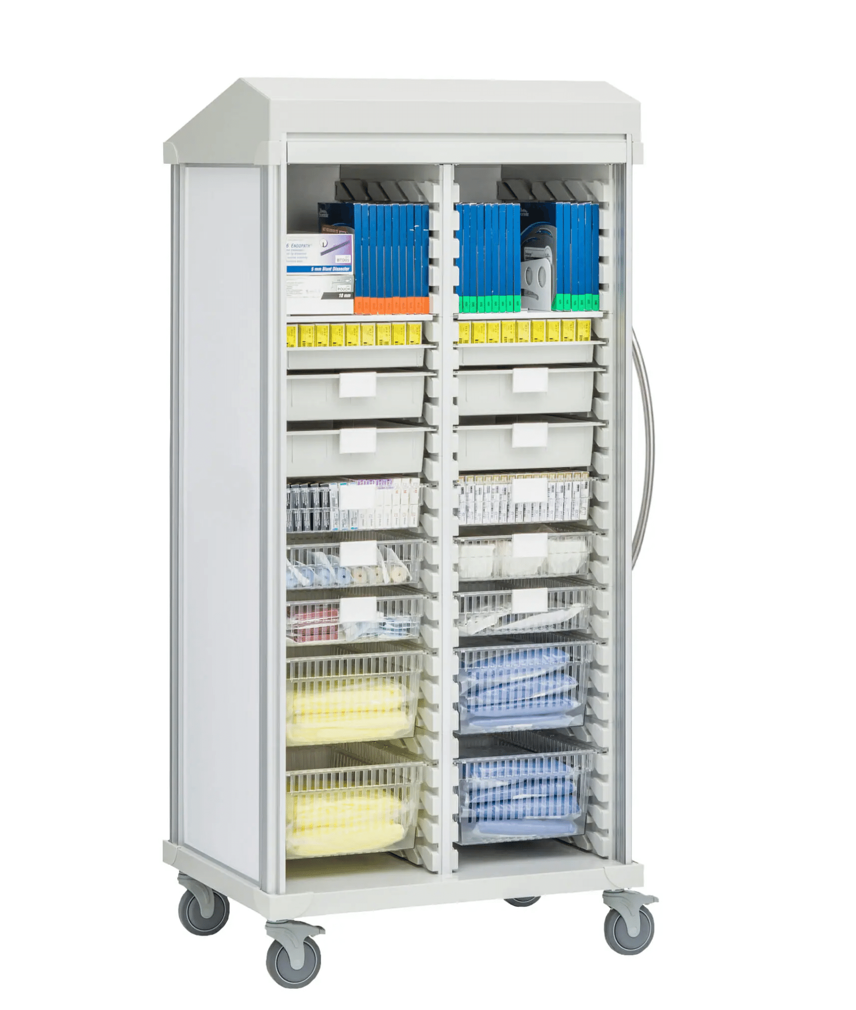 Roam high-density, mobile medical carts maximize space in an efficient footprint. Two heights, four widths, door and lock options, flexible interior and procedure-specific accessories, and a range of preconfigured and specialty carts give Roam medical supply carts broad application throughout a healthcare facility.